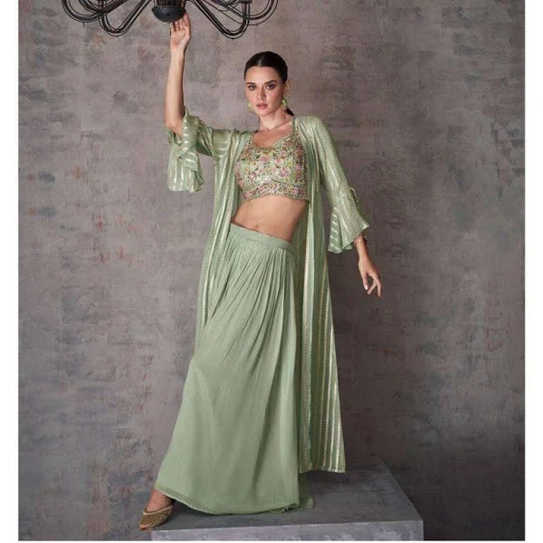 Elevate your style with this stunning Indowestern outfit, complete with a palazzo, crop top, and shrug. This ensemble is perfect for a range of occasions, including parties, weddings, festivals, evenings, and traditional and Indian events.